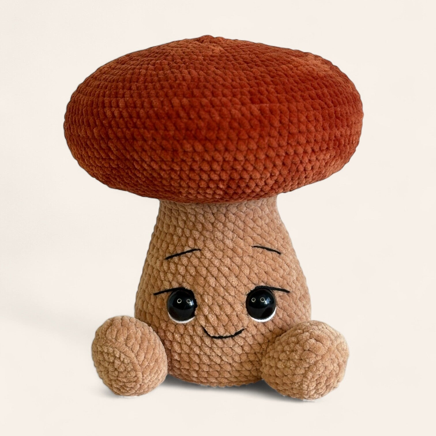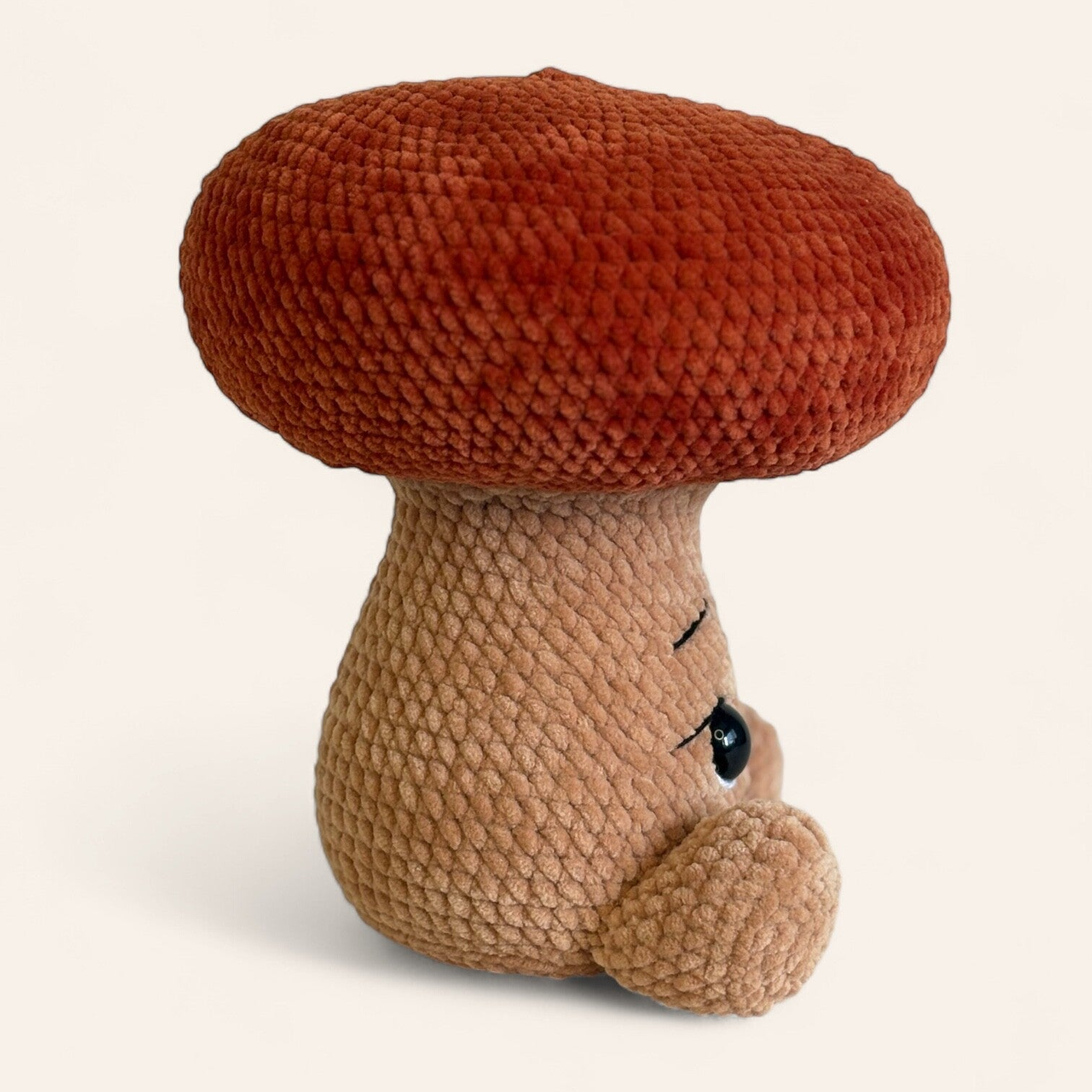 Deze zachte paddenstoel is met de hand gehaakt van chenille garen en gevuld met polyester vulling. Door zijn vriendelijke uitstraling en zachte materialen is hij ideal als knuffelvriendje, kraamcadeau of gewoon als decoratie.